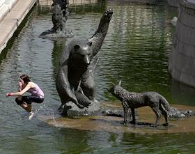 Жара в Москве. Девушка прыгает в фонтан на Манежной площади.