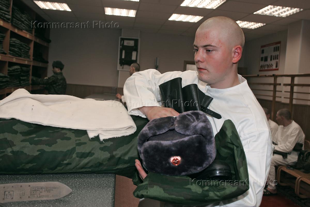 Осенний призыв. Выдача новой амуниции для новобранцев на складе.