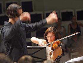 Дирижер Теодор Курентзис (слева) и скрипачка Елена Ревич (справа) во время выступления на концерте в…