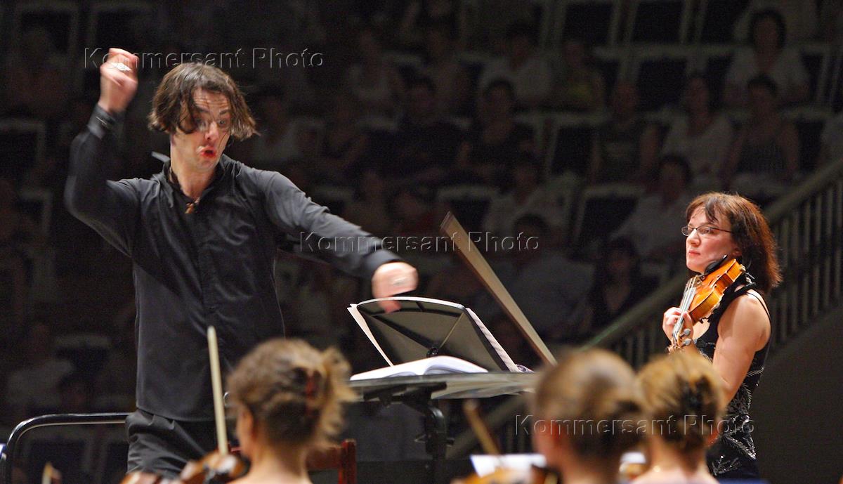Дирижер Теодор Курентзис (слева) и скрипачка Елена Ревич (справа) во время выступления на концерте в…