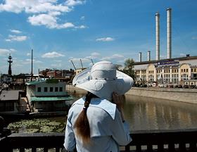 Девушка в шляпе на мосту через Москву-реку на фоне плавучего ресторана "Поплавокъ".