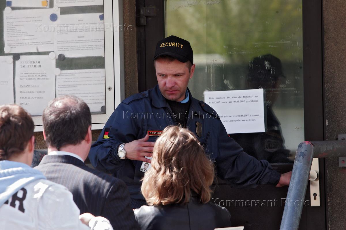 Сотрудник охраны Консульского отдела Посольства Германии проверяет документы у людей из очереди.