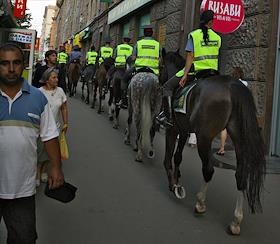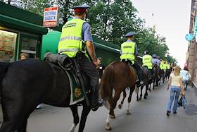 Сотрудники конной милиции во время патрулирования в районе станции метро "Сокол".
