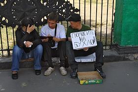 Двое мужчин и женщина сидят на улице и держат табличку "Помогите на бухло".