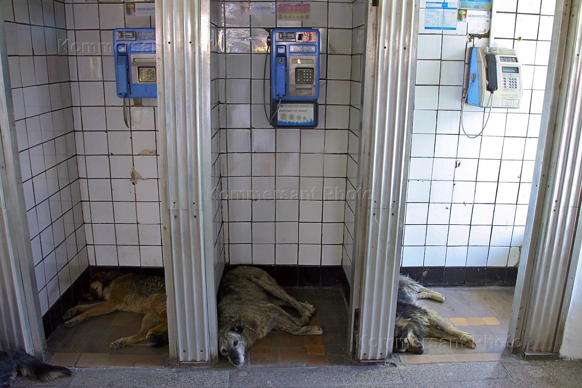 Бродячие собаки спят в телефонных кабинках в подземном переходе.