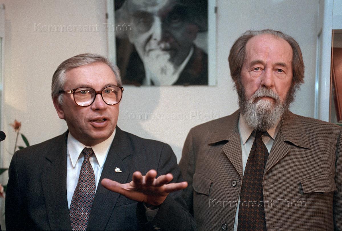 Депутат Государственной Думы России Владимир Лукин (слева) и писатель Александр Солженицын (справа)…