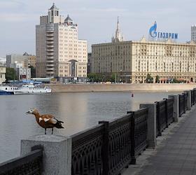 Набережная Москва-реки в районе Кутузовского проспекта. Дикая утка сидит на ограждении реки. Реклама…