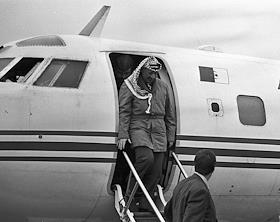 Палестинский лидер Ясир Арафат выходит из самолета после прилета.