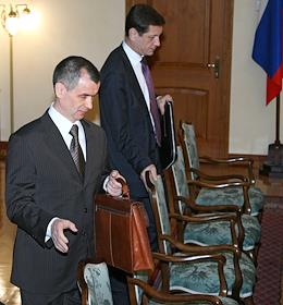 Председатель Правительства России Михаил Фрадков (справа) и его первый заместитель Сергей Иванов…