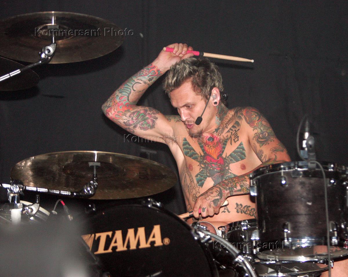 Барабанщик с татуировками на теле во время выступления на концерте гитариста Стива Вая в клубе "Б1…