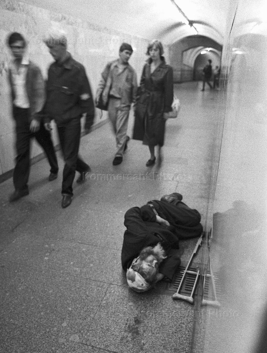 Бомж спит в переходе метро
