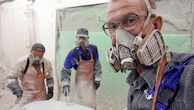 Рабочие в защитных распираторах в цехе производства джакузи.