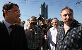 Пресс-секретарь главы концерна "Газпром" Сергей Куприянов (справа) вышел к участникам пикета,…