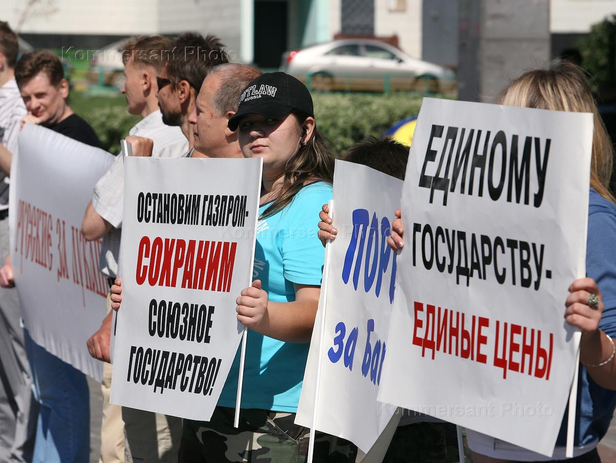 Экономика и бизнес Пикет в поддержку Союзного государства у здания "Газпрома". Основной лозунг пикета "Газпром - враг народов". Организатор - движение "Лукашенко-2008".