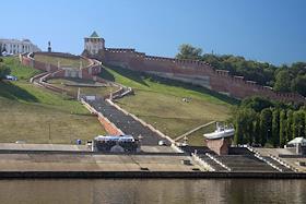 Вид на Нижний Новгород с Волги. Чкаловская лестница и кремлевская стена. Катер "Герой" на…