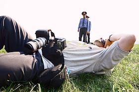 Международный Авиакосмический салон "МАКС - 2007". Фотограф с аппаратурой разговаривает по…
