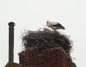 Гнездо аиста на крыше дома.