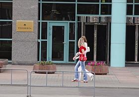 Вывеска компании "Роснефть" на здании главного офиса компании "ЮКОС" на Дубининской улице.