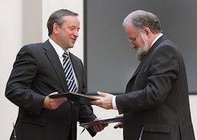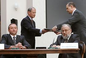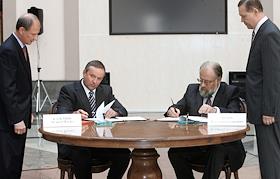 Председатель правления "Сбербанка России" Андрей Казьмин (справа) во время подписания договоров о…