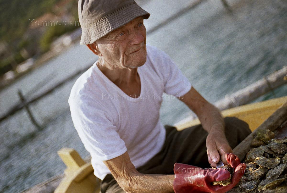 Рабочий на плантации по выращиванию мидий.