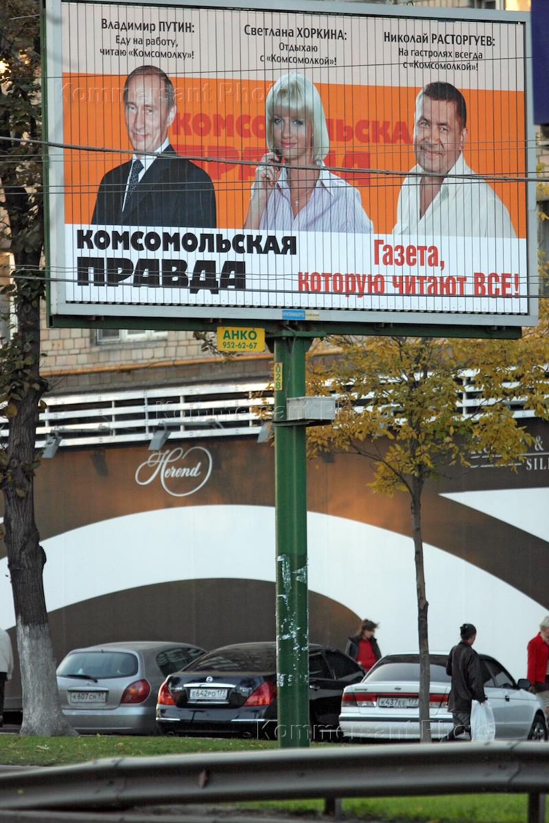 Рекламный щит газеты "Комсомольская правда" с портретами В.Путина, Н.Расторгуева и С.Хоркиной.