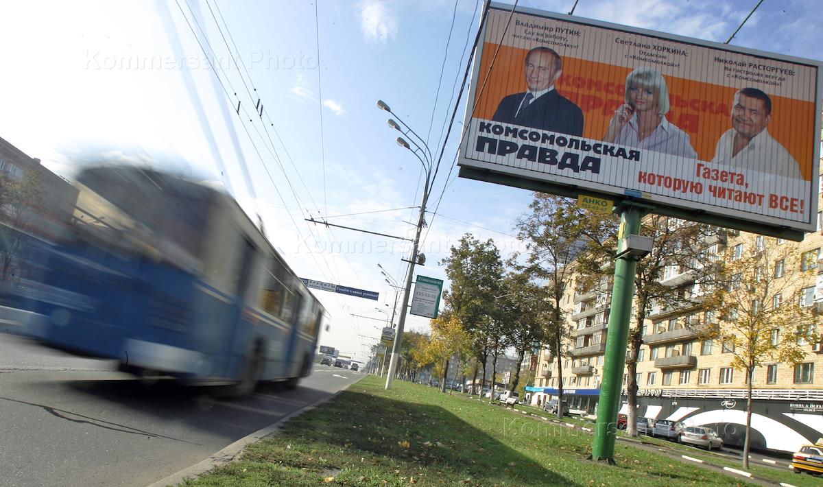 Рекламный щит (билборд) газеты "Комсомольской правды" на Ленинском проспекте. Портреты Президента…