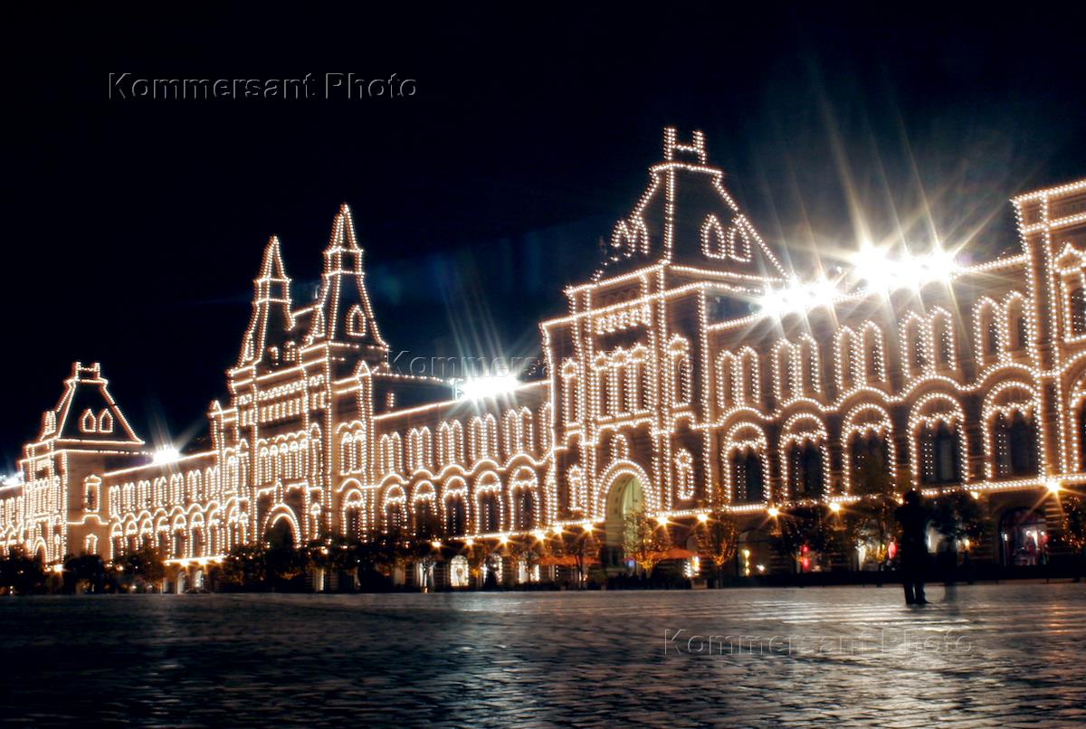 Здание магазина ГУМ в ночном освещении.