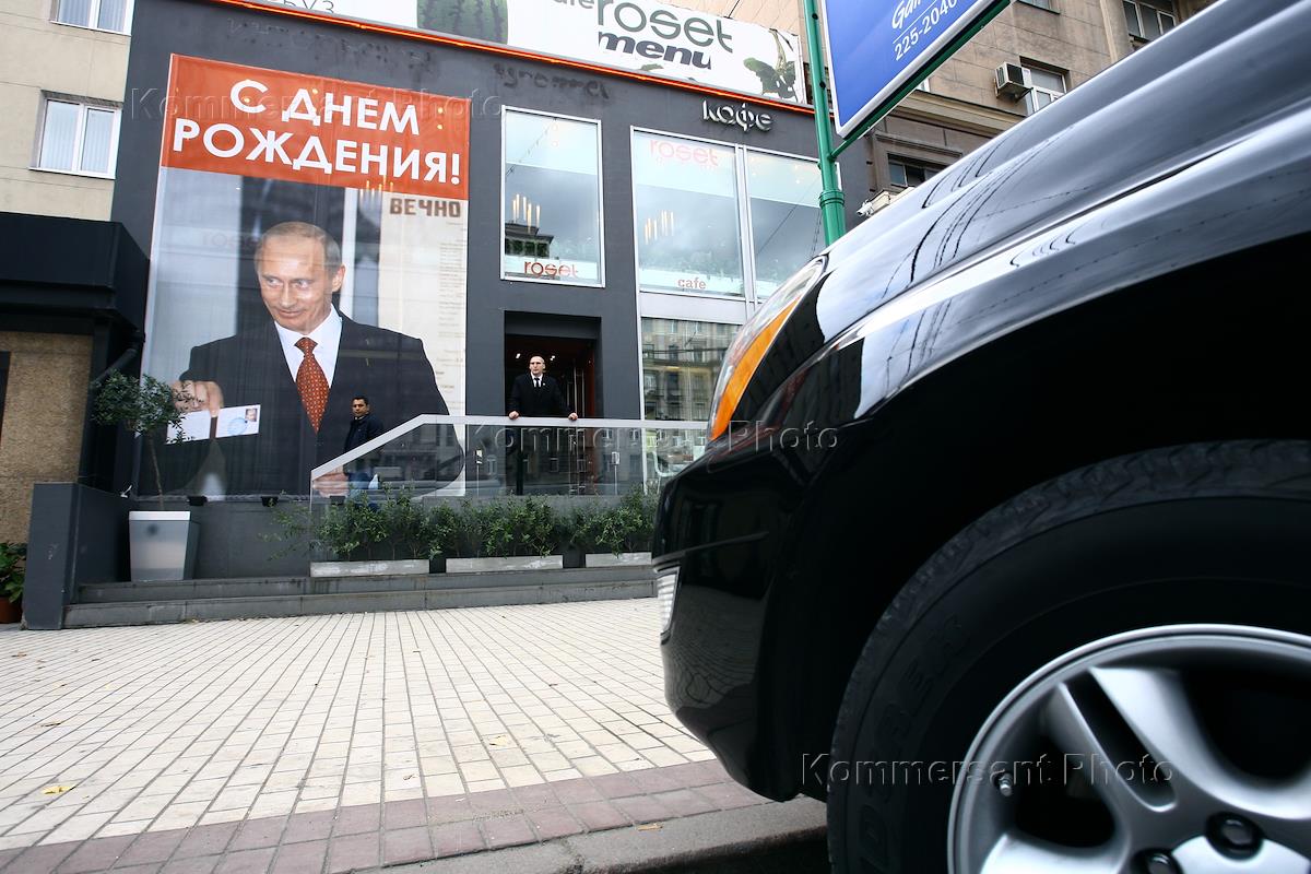Плакат "С днем рождения!" с изображением Президента России Владимира Путина на Кутузовском проспекте.