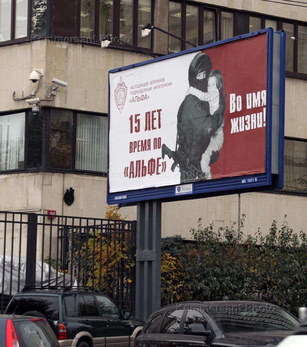 Рекламный щит Ассоциации ветеранов подразделения антитеррора "Альфа" "15 лет время по "Альфе".