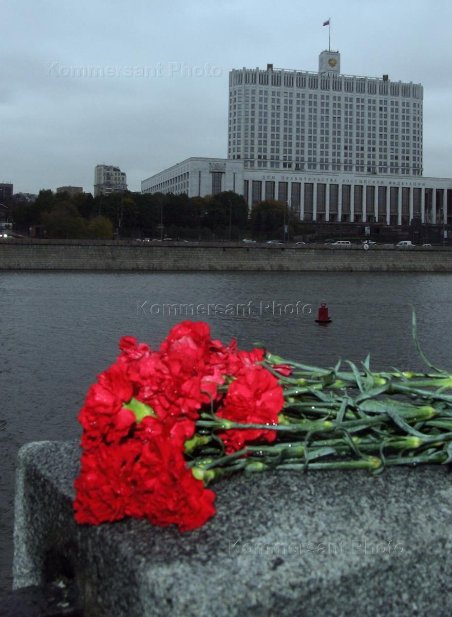 Виды Москвы. Дом Правительства России (Белый Дом) и гвоздики на парапете набережной.