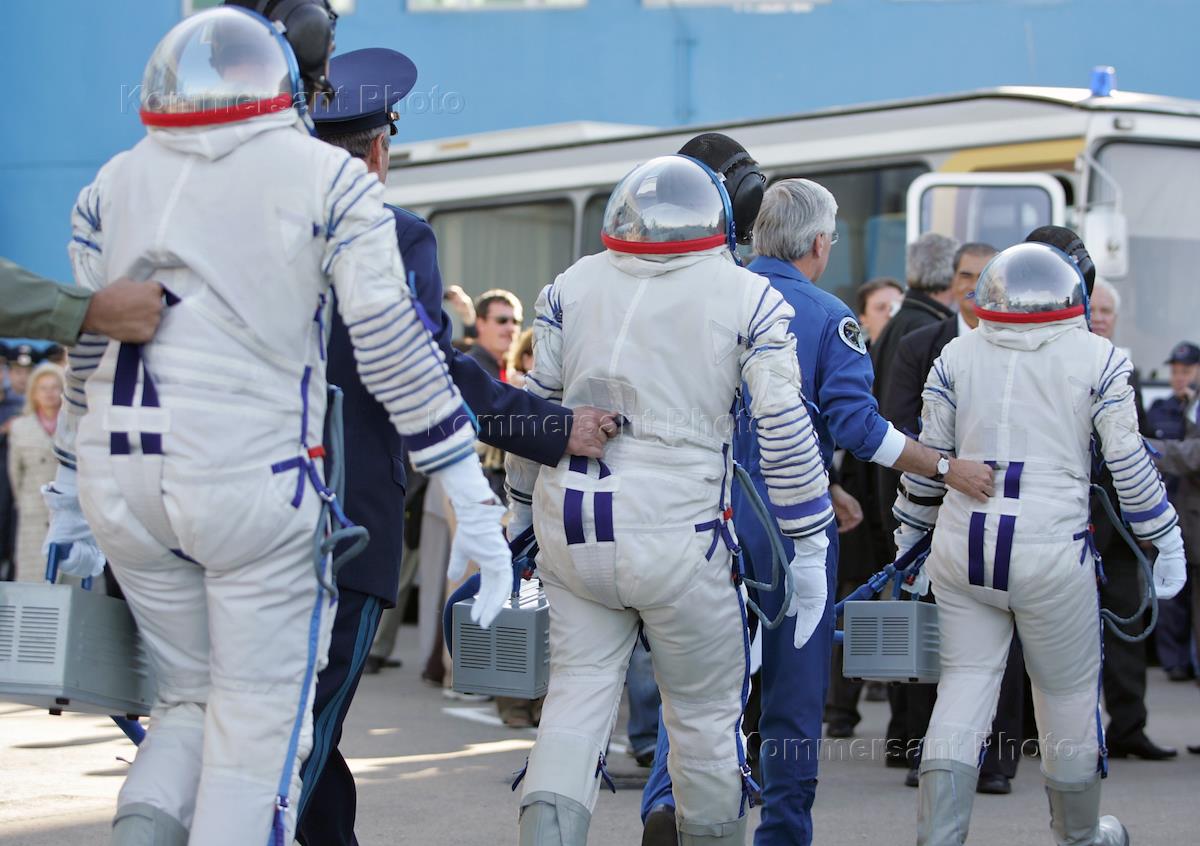 Члены космического экипажа корабля "Союз ТМА-11" перед стартом 16-ой экспедиции на МКС на…
