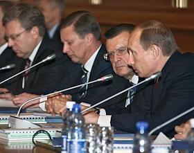 Президент России Владимир Путин (справа), председатель Правительства России Виктор Зубков (в центре)…