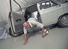 Оператор снимает лежащего на асфальте художника Германа Виноградова, обливающегося водой из ведра.…