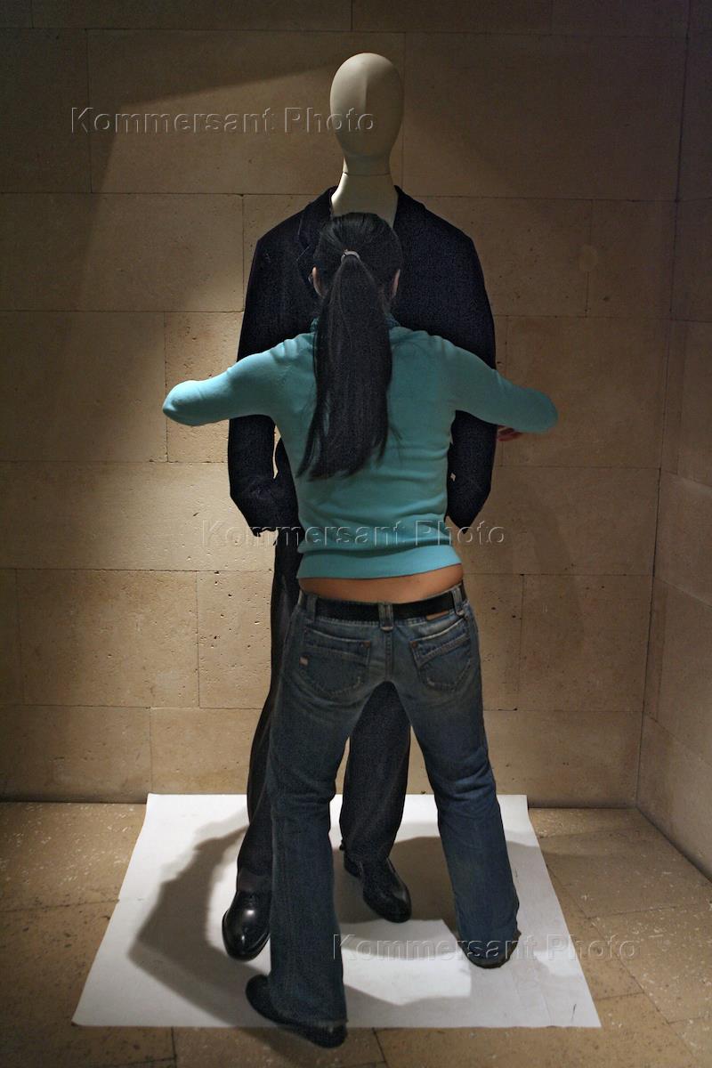 Девушка продавец одевает манекен в бутике "Giorgio Armani" (Джорджио Армани).