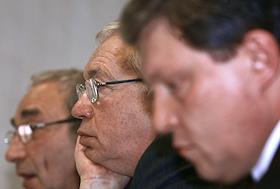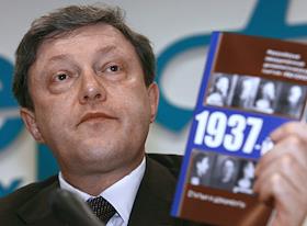 Лидер российской демократической партии "Яблоко" Григорий Явлинский (в центре) на пресс-конференции,…