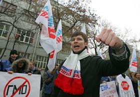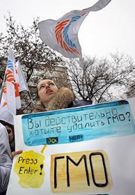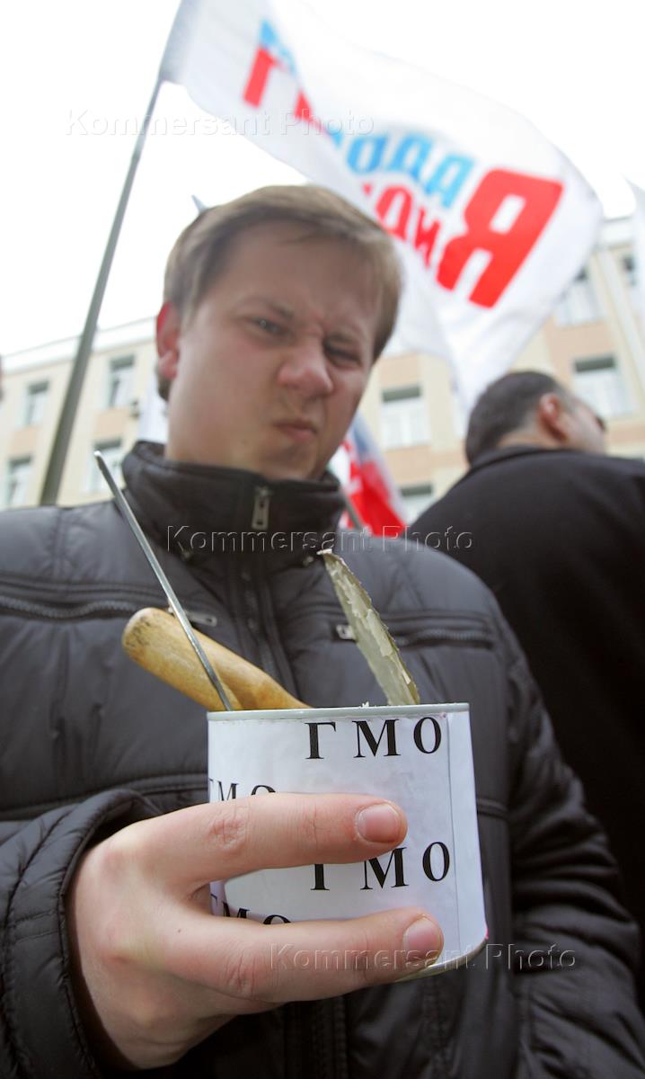 Экономика и бизнес Пикет, инициированный движением "Молодая Гвардия" Единой России" около здания Роспотребнадзора. Активисты движения требуют призвать к ответсвенности Геннадия Онищенко, который стал инциатором поправки в Федеральный закон "О защите прав потребителей", позволяющий не маркировать продукты "как содержащие генно-модифицированные компоненты".