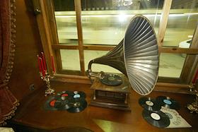 Интерьеры нового ресторана "Пяткинъ". Граммофон с пластинками на подоконнике.