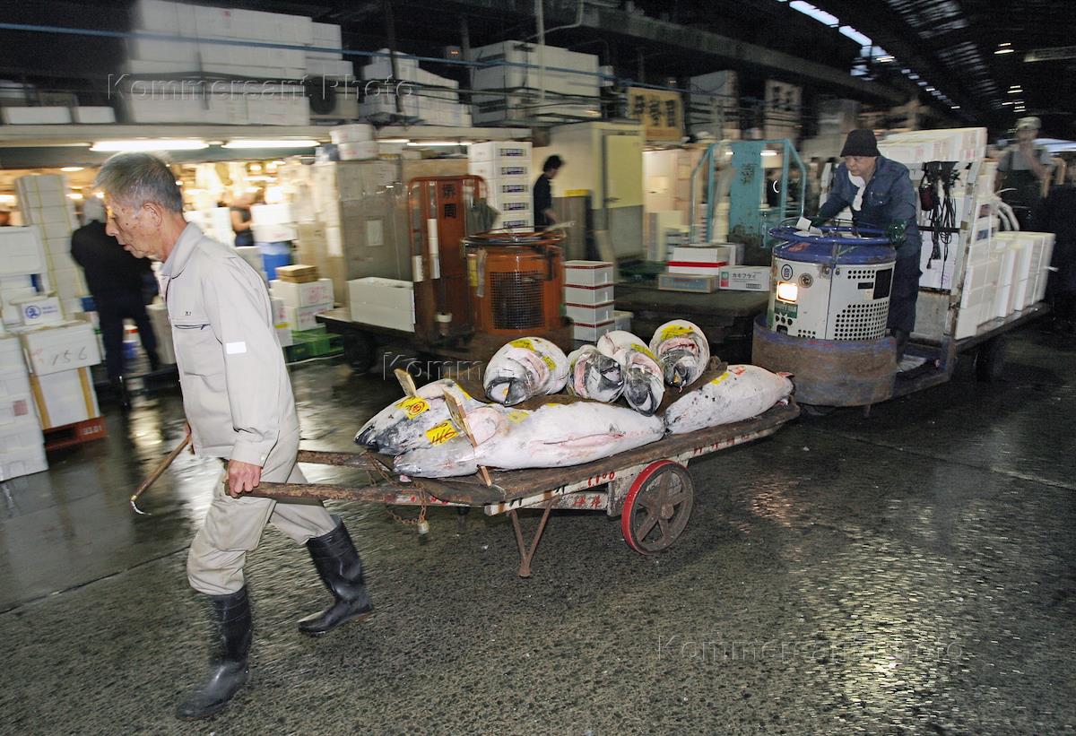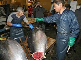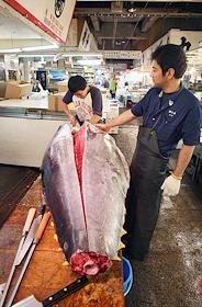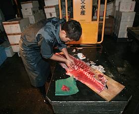 Рыбный рынок в Токио. Продавец разделывает тушу рыбы.