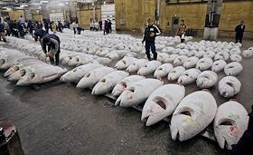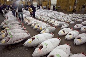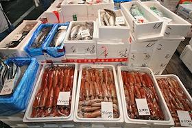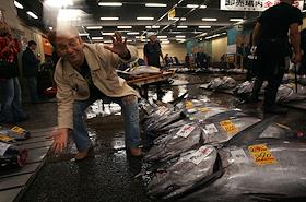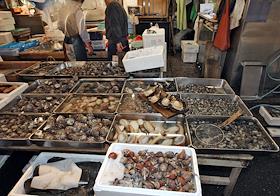 Рыбный рынок в Токио. Продавец раскладывает товар.