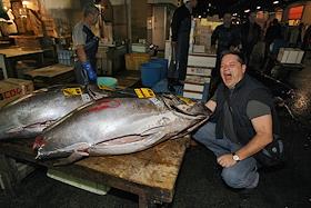Мужчина японец разделывает тушу рыбы на Рыбном рынке.