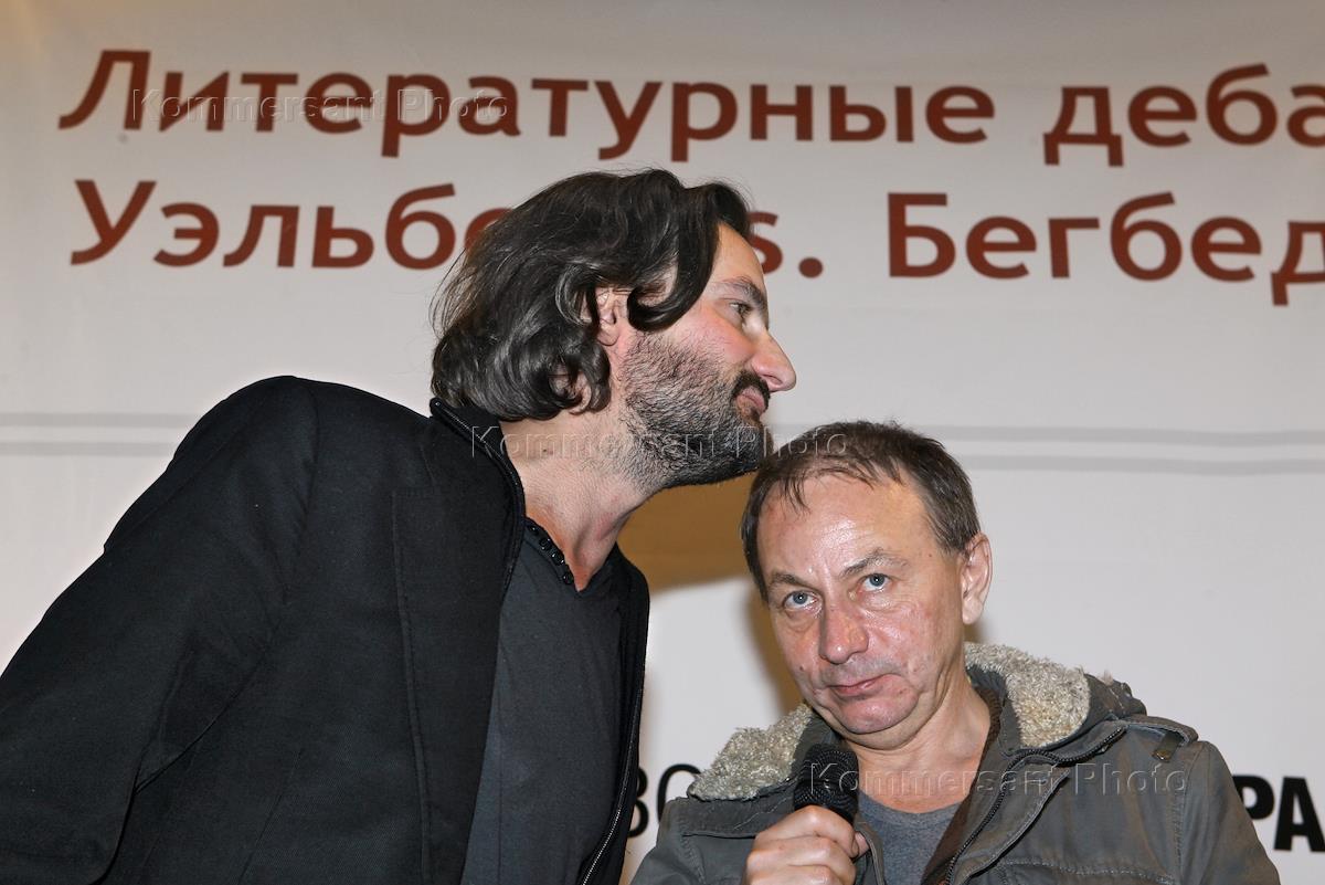 Французские писатели Фредерик Бегбедер (слева) и Мишель Уэльбек (справа) в время публичных дебатов в…