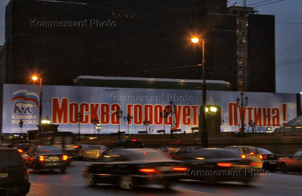 Плакат с надписью "Москва голосует за Путина" на здании, строящейся гостиницы "Москва" на Охотном…
