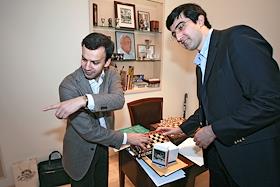 Чемпион мира по шахматам Владимир Крамник (справа) во время ежемесячного заседания "Шахматной…