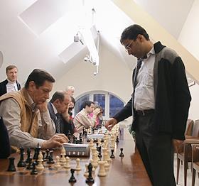Шахматист из Индии Вишванатан Ананд (слева) во время ежемесячного заседания "Шахматной гостиной…