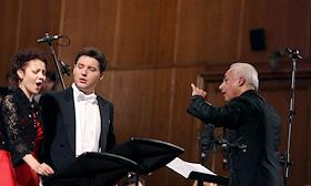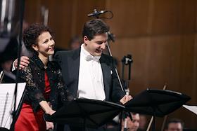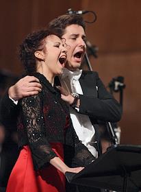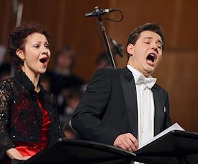 Оперные певцы Марина Зятькова (слева) и Дмитрий Корчак (справа) во время концерта "Шедевры…