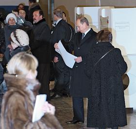 Голосование президента России Владимира Путина, лидеров и членов партии "Единая Россия" на выборах Депутатов Государственной Думы V созыва 2007 г. на избирательном участке.