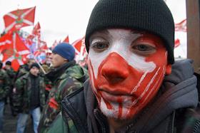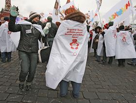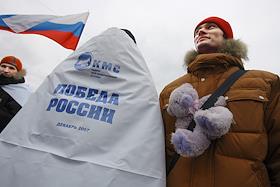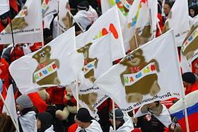Участники молодежного движения "Наши" во время многотысячной акции, на которой поздравили партию…