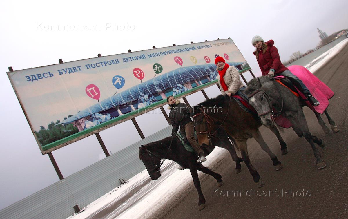 Девушки на лошадях едут на фоне рекламного плаката о строительстве детского многофункионального…