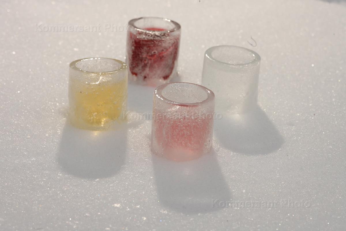 Рюмки изо льда с разноцветной жидкостью на снегу.