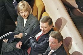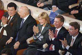 Певец Иосиф Кобзон (слева), мэр Москвы Юрий Лужков (второй слева), первый заместитель председателя…